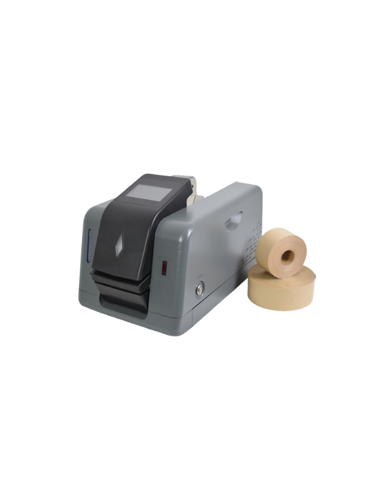A multimode function gummed paper dispensor with a customizable color, logo and packaging.